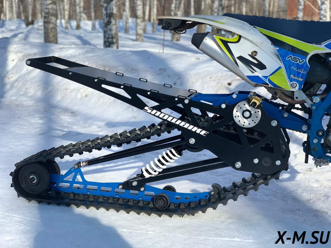 Folk 121 от Snowbike — универсальный гусеничный комплект для внедорожных мотоциклов. Гусеничный мотоцикл (СНОУБАЙК) это, по сути, одноколейный снегоход. Вы получаете возможность продлить мото сезон и эксплуатировать мотоцикл не только летом но и зимой.