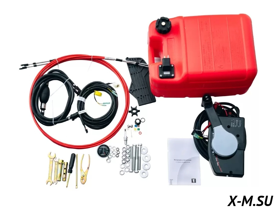 — выносной бак 24 л; — алюминиевый винт, шаг 9-7/8*11 1/4 — машинка газ-реверс (тянет газ) — трос газ-реверс (13 футов) — рулевая тяга — набор крепежа — чека безопасности; —...